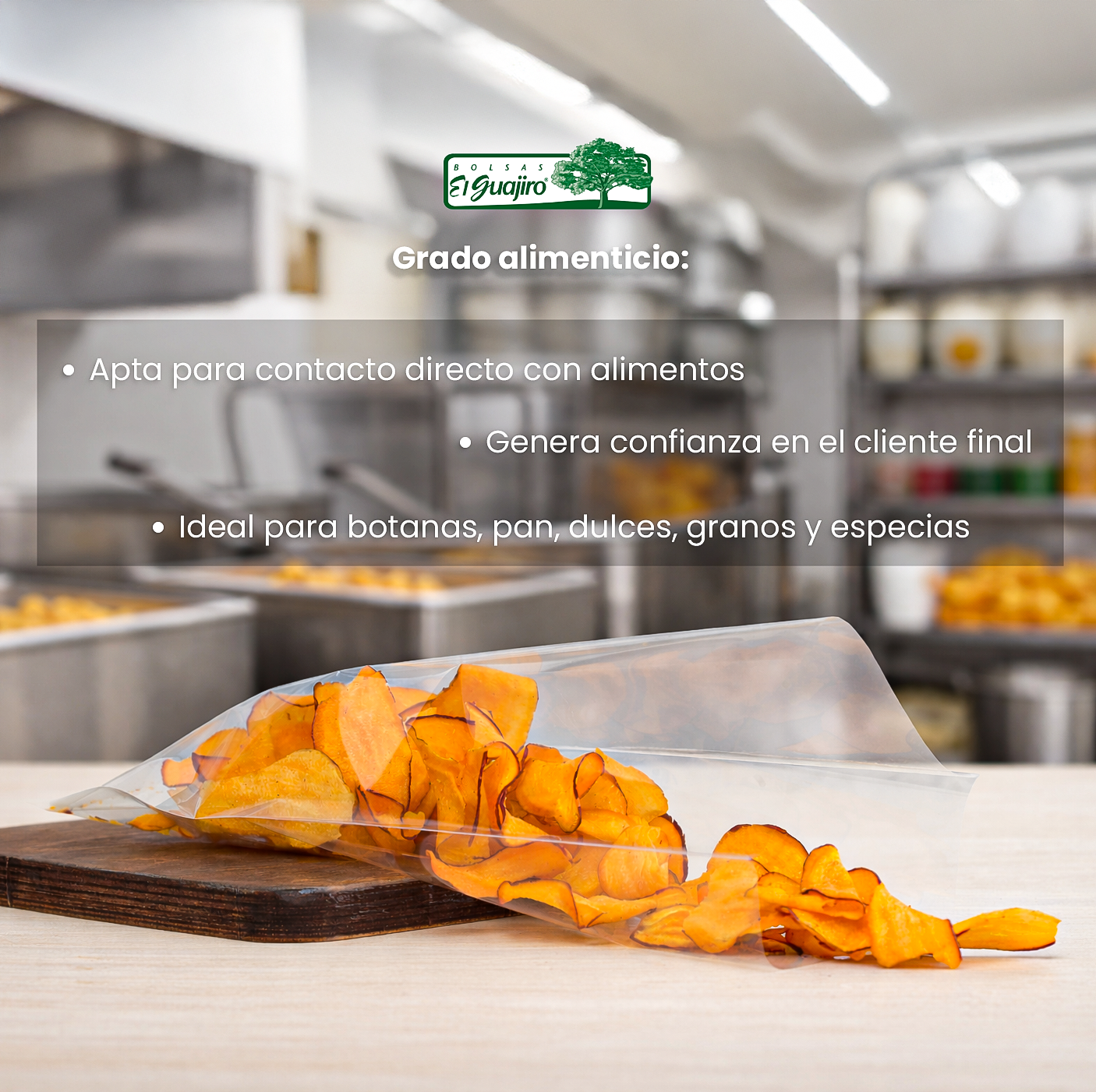 Está fabricada con material de grado alimenticio, 35 micras de espesor y sellos laterales reforzados, lo que brinda resistencia, seguridad y desempeño confiable durante el llenado, manejo y transporte.